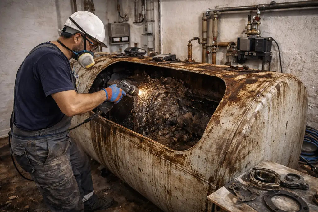 Was viele nicht wissen: Im Inneren des Tanks sammeln sich mit der Zeit Ablagerungen, die Funktion, Sicherheit und Lebensdauer der gesamten Anlage beeinträchtigen.