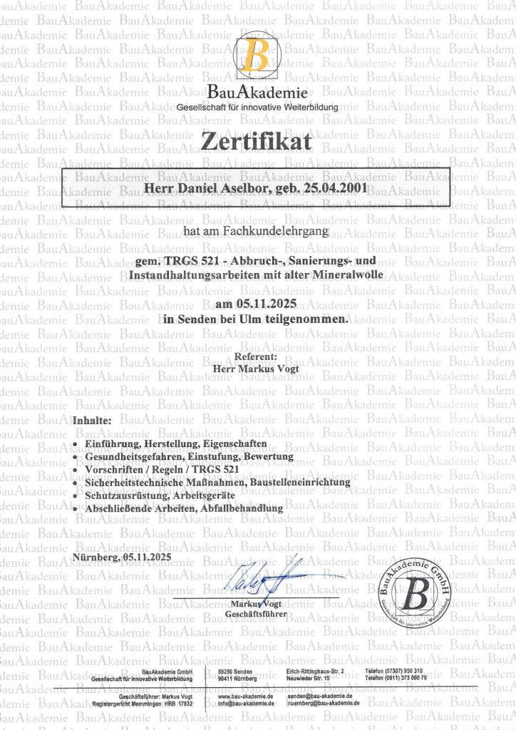 Unsere Zertifikate bestätigen, dass wir nach anerkannten Normen, gesetzlichen Vorgaben und branchenspezifischen Standards arbeiten. Sie dokumentieren nicht nur unsere fachliche Kompetenz, sondern auch unser kontinuierliches Engagement für Qualitätssicherung, Arbeitsschutz und Umweltschutz. Für unsere Kunden bedeutet das: maximale Sicherheit, transparente Prozesse und verlässliche Leistungen – von der Planung bis zur Umsetzung.